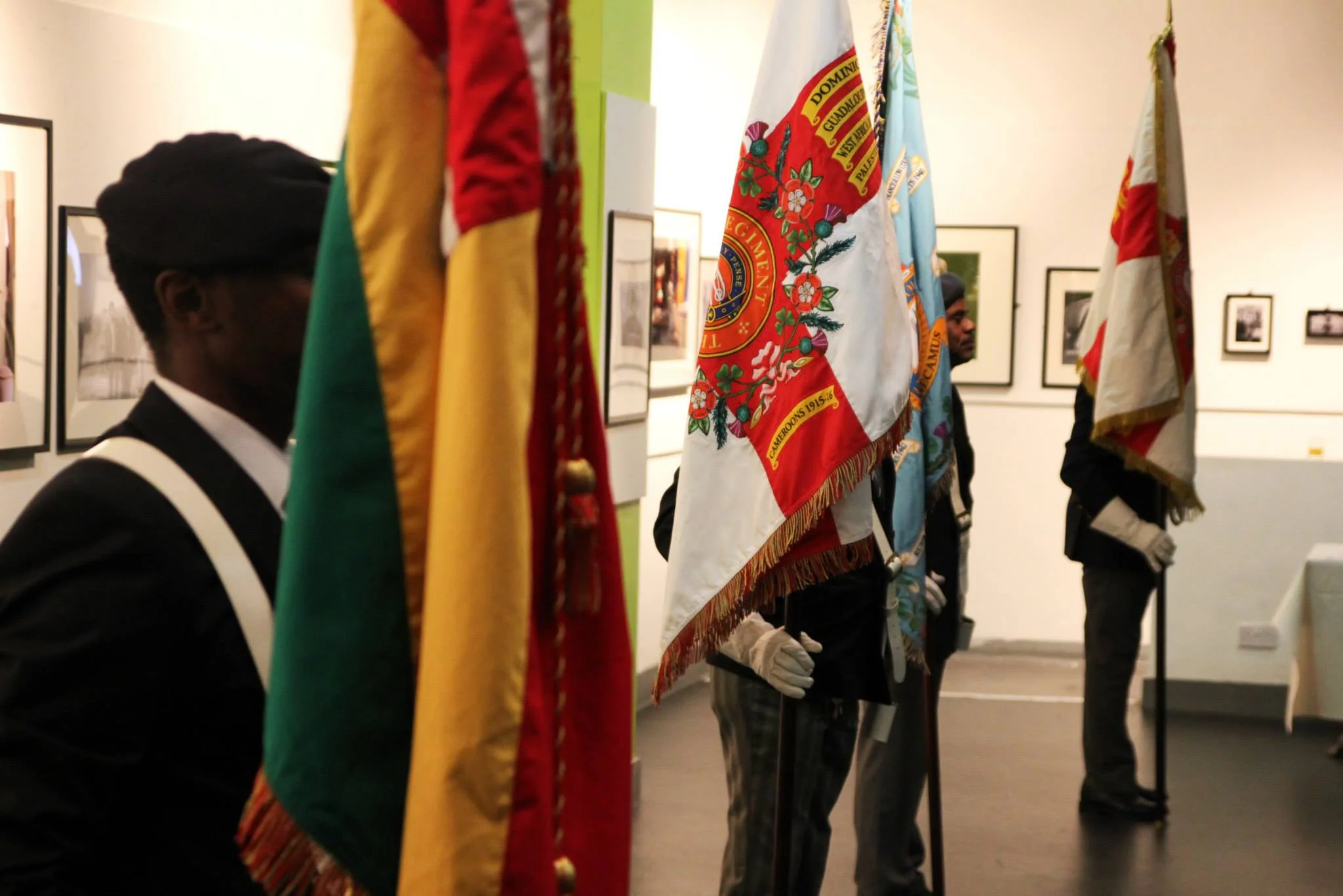 Portrait sitters and project participants leading a procession through the gallery space with battle standards, before presenting their censored history to the audience - in their own words.